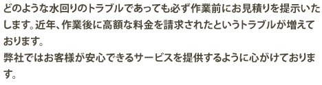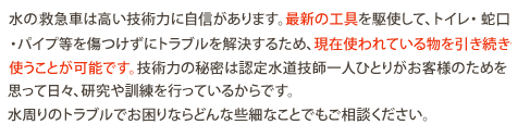 文京区の歴史あるエリアに佇む水の救急車文京区店は、皆様に次のことをお約束します。常に親切で丁寧な接客、清潔感あふれる服装、安心して頂ける価格設定、そして作業前には詳細な説明を行います。文京区の風情を大切にし、地域の皆様の快適な生活環境を守ります。